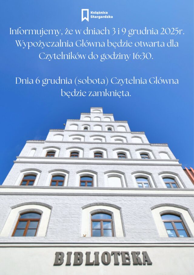 Informujemy, że w dniach 3 i 9 grudnia 2025 r. Wypożyczalnia Główna będzie otwarta dla Czytelników do godziny 16:30.
